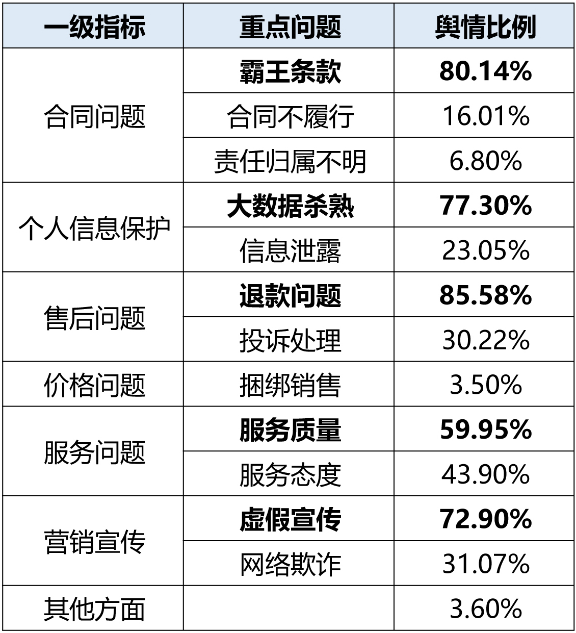 具体来看,合同服务舆情中,有80.14%涉及霸王条款,亟待改善。个人信息保护舆情中,有77.30%的比例涉及大数据杀熟,亟待改进。售后服务舆情中,有85.58%的比例涉及退款问题,亟待改进。服务问题舆情中,有59.95%的比例涉及服务质量,有待改进。营销宣传舆情中,有72.90%的比例涉及虚假宣传问题,亟待改进。