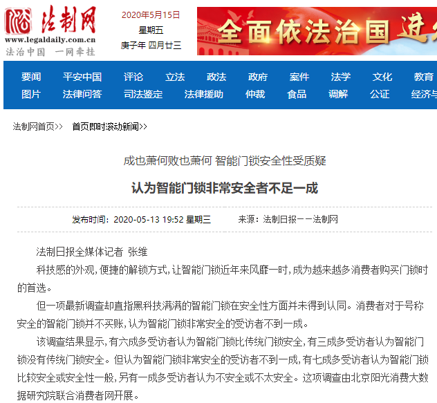 显然,智能门锁给人们生活带来便利的同时,也带来了新的风险问题。智能门锁的产品质量安全,直接关系到消费者的财产和人身安全,必须引起足够重视。