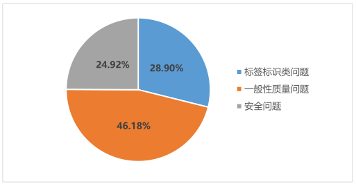 一般性质量问题326个,占比46.18%;宣传标签标识问题204个,占比28.90%;安全问题176个,占比24.92%。说明测试商品不达标的原因主要是一般性质量问题,其次是宣传及标签标识问题,此外是安全问题。