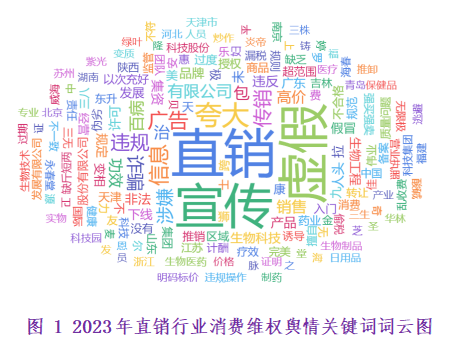 通过对以上指标体系和采集规则,本报告采集了2023年1月份至2023年12月份的直销行业消费维权舆情,共计25978条。通过对每条数据关键词进行词云统计,得到词云图如下: